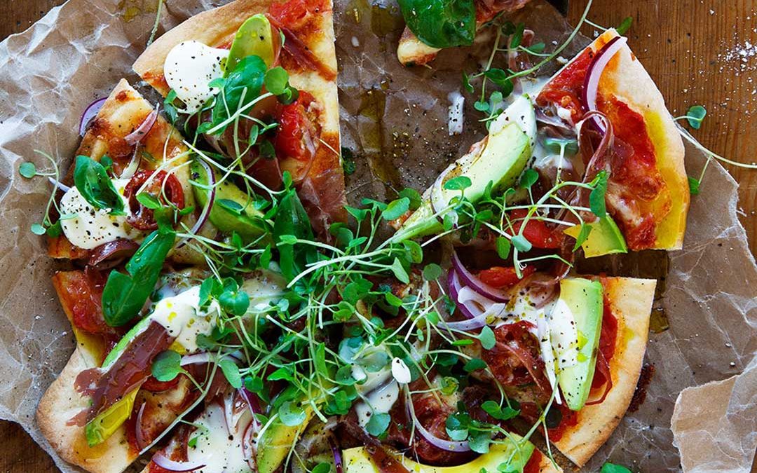 對披薩愛好者來說,把新鮮的火腿和牛酪梨放在酥脆的底料是不錯的選擇。